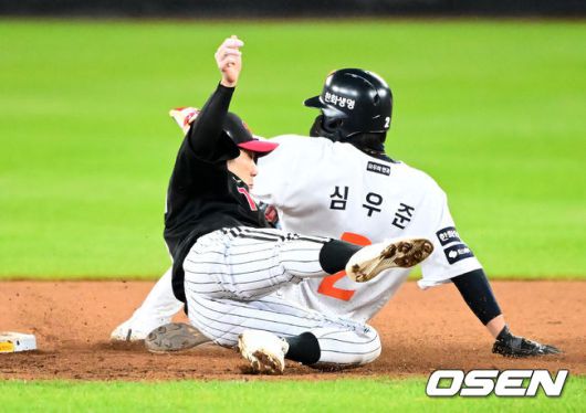 7회말 1사 1루에서 한화 심우준이 LG 신민재에 태그아웃 당하며 2루 도루에 실패하고 있다. 2025.10.29 /jpnews@osen.co.kr