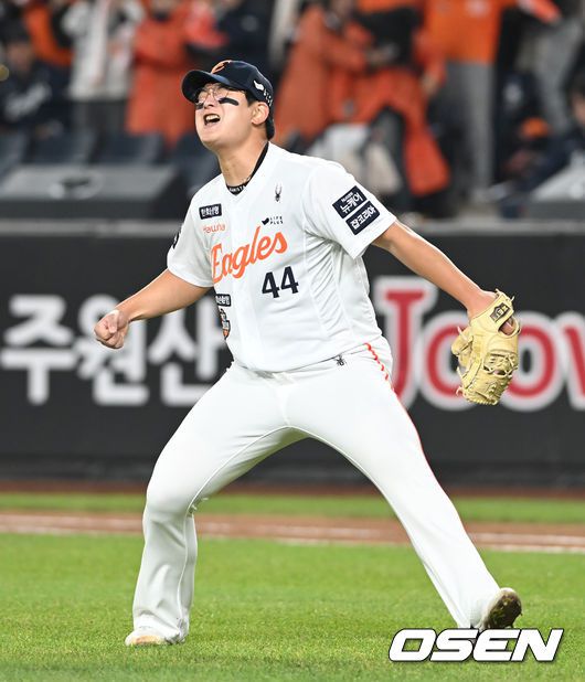 [OSEN=대전, 손용호 기자] 29일 대전 한화생명볼파크에서 2025 신한 SOL Bank KBO리그 한국시리즈 3차전 한화 이글스와 LG 트윈스의 경기가 열렸다. 이날 경기에 한화는 폰세를, LG는 손주영을 선발투수로 내세웠다. 9회초 1사 1루 한화 김서현이 문성주를 병살로 처리하고 기뻐하고 있다. 2025.10.29 /spjj@osen.co.kr