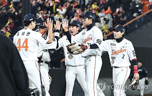 (대전=연합뉴스) 김인철 기자 = 29일 대전한화생명볼파크에서 열린 2025 프로야구 KBO리그 포스트시즌 한국시리즈 3차전 LG 트윈스와 한화 이글스의 경기. 9회초 7-3으로 승리를 확정지은 한화 선수들이 승리를 자축하고 있다. 2025.10.29