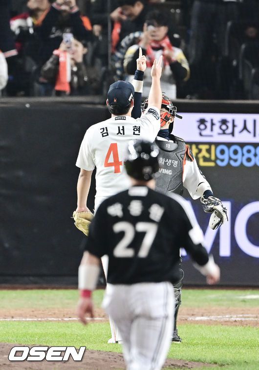 경기종료 후 한화 김서현과 최재훈이 승리의 기쁨을 나누고 있다. 2025.10.29 / soul1014@osen.co.kr