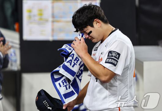 29일 대전 한화생명볼파크에서 열린 프로야구 2025 신한 SOL뱅크 KBO 포스트시즌 한국시리즈 3차전 LG 트윈스와 한화 이글스의 경기, 한화 마무리 투수 김서현이 9회초를 무실점으로 마치고 더그아웃으로 들어와 눈물을 닦고 있다. 2025.10.29/뉴스1 ⓒ News1 김도우 기자