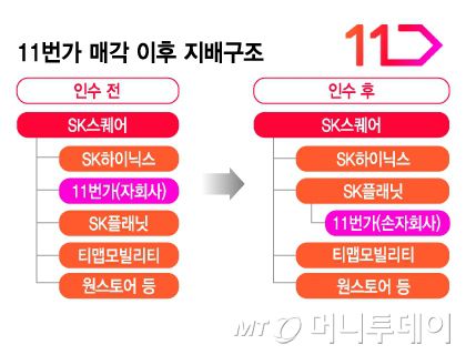 SK스퀘어는 29일 공시를 통해 11번가 경영권 지분 100%(약 6607억원)를 SK플래닛에 매각한다고 밝혔다. SK플래닛이 11번가 지분 100%를 인수함으로써 'SK스퀘어-SK플래닛-11번가'로 지배구조가 변경된다. 11번가는 SK스퀘어의 자회사에서 손자회사로 바뀌고 SK플래닛의 100% 자회사가 되는 구조다.