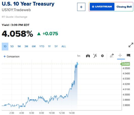 뉴욕채권시장에서 29일(현지시간) 오후 3시기준 미 10년 만기 국채수익률은 전장보다 7bp(1bp=0.01%포인트) 오른 4.05% 기록 중이다. 2년물은 9bp 상승한 3.58%, 30년물은 5bp 오른 4.60%에서 움직이고 있다.