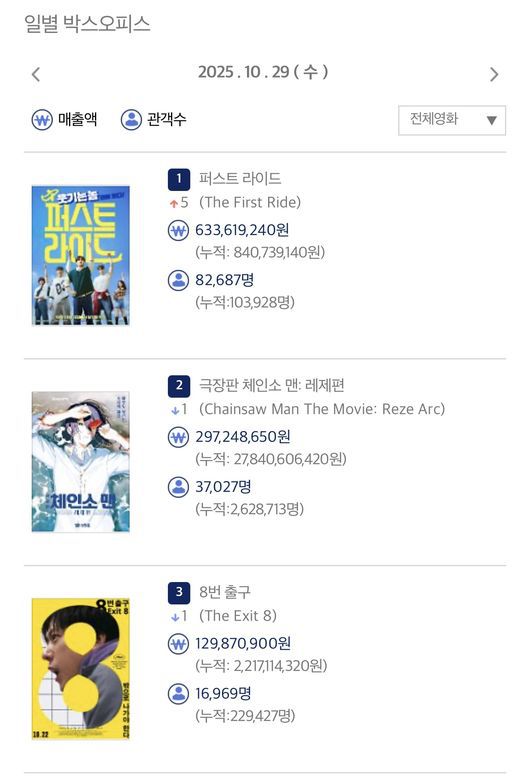 '퍼스트 라이드'가 10월 29일(수) 개봉 첫 날 82,687명(누적 관객수 103,928명)을 동원하며 '극장판 체인소 맨: 레제편'을 제치고 압도적 박스오피스 1위에 올랐다. 이는 385만 흥행작 '소방관'의 오프닝 스코어(81,673명)를 경신한 수치다. 또한, 강하늘의 전작이자 337만을 동원하며 2025년 한국영화 흥행 2위를 기록하고 있는 '야당'의 오프닝 스코어(85,705명)을 잇는 기록으로 앞으로 펼쳐질 유쾌한 입소문 레이스에 대한 기대감을 모은다.