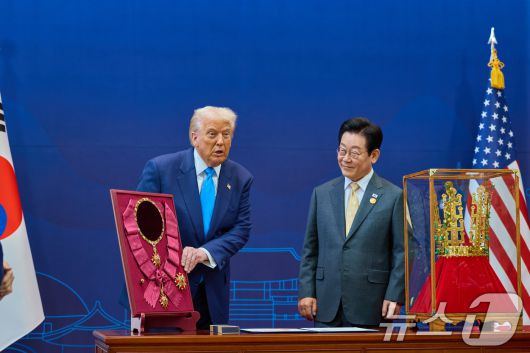 이재명 대통령이 29일 경북 경주박물관에서 열린 한미 공식 환영식에서 도널드 트럼프 미국 대통령에게 무궁화 대훈장 수여와 천마총 금관 모형을 선물하고 있다. (대통령실 제공. 재판매 및 DB 금지) 2025.10.29/뉴스1 ⓒ News1 허경 기자 |