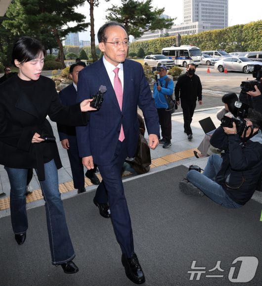 (서울=뉴스1) 오대일 기자 = 국회의 계엄해제 의결을 방해한 의혹을 받는 추경호 전 국민의힘 원내대표가 30일 오전 서울 서초구 서울고등검찰청에 마련된 내란 특검팀(특별검사 조은석) 사무실에서 피의자 신분으로 조사를 받기 위해 출석하고 있다. 2025.10.30/뉴스1