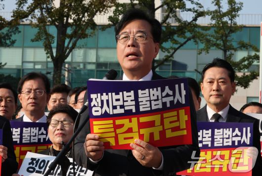 (서울=뉴스1) 장수영 기자 = 송언석 국민의힘 원내대표가 30일 오전 내란특검이 위치한 서울고등법원 앞에서 열린 긴급 현장 의원총회에서 발언을 하고 있다. 2025.10.30/뉴스1presy@news1.krCopyright ⓒ 뉴스1. All rights reserved. 무단 전재 및 재배포, AI학습 이용 금지.