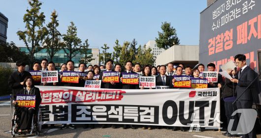 (서울=뉴스1) 장수영 기자 = 장동혁 국민의힘 대표와 송언석 원내대표 등 의원들이 30일 오전 내란특검이 위치한 서울고등법원 앞에서 열린 긴급 현장 의원총회에서 특검 규탄 구호를 외치고 있다. 2025.10.30/뉴스1presy@news1.krCopyright ⓒ 뉴스1. All rights reserved. 무단 전재 및 재배포, AI학습 이용 금지.