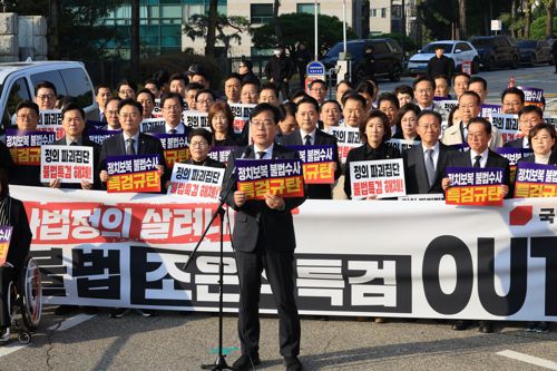 송언석 원내대표는 "조은석 특검의 추경호 전 원내대표에 대한 수사는 개인에 대한 수사가 아니라 원내 2당인 국민의힘을 내란 세력으로 엮어 말살하겠다는 시도"라며 "야당의 존재를 지워버리겠다는 무도한 책동"이라고 비판했습니다.