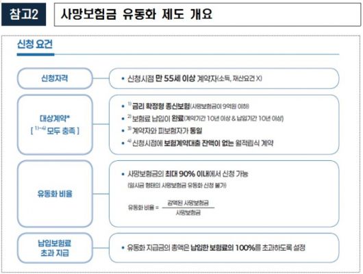 금융위원회는 삼성생명, 한화생명, 교보생명, 신한라이프, KB라이프 등 5개 생보사의 41만4000건 계약(가입금액 23조1000억원)에 대해 1차적으로 사망보험금을 생전 연금으로 바꾸는 유동화 신청이 가능하다고 30일 밝혔다. 1차 출시 보험사의 유동화 가능 계약을 보유하고 있는 소비자에게는 23일~25일 개별 안내 됐으며 유동화 신청 전 시뮬레이션과 비교결과표 등을 참고해 본인에게 적합한 유동화 비율과 금액을 선택하면 된다.