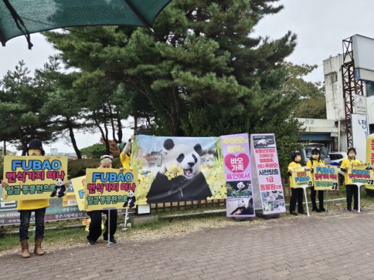 이날 동물보호단체 ‘푸바오와 푸덕이들’ 회원 15명은 경주 황남동 천마총 인근에서 집회를 열었다. “푸바오가 한국에 돌아올 수 있도록 도와달라”는 취지에서다. 이들은 푸바오가 ‘번식 기지’를 떠나 일급 동물원에서 생활해야 한다는 취지의 팻말도 들었다. 그러면서 “시진핑 주석은 판다의 기본 생리에 맞는 높은 나무와 맑은 물, 대나무 죽순을 제공하라”고도 요구했다.