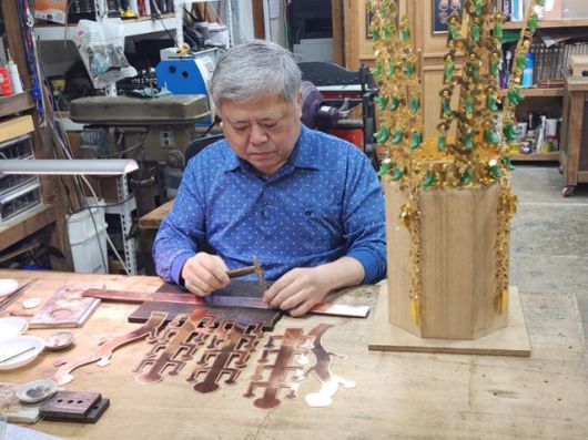 김진배씨가 경북 경주시 하동민속공예촌 내 삼성방에서 금관을 제작하고 있다. 본인 제공 |