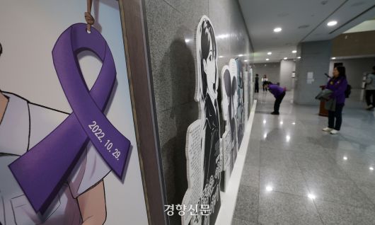 10·29 이태원참사 3주기인 29일 국회 의원회관에서 열린 전시 ‘고통의 곁, 곁의 고통’ 개막식에서 참사 유가족이 전시 작품을 관람하고 있다. 권도현 기자 |