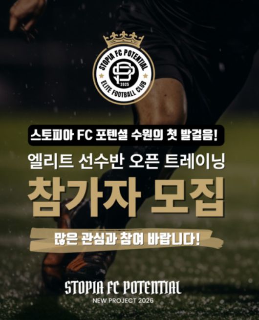 스토피아FC포텐셜 수원은 보도자료를 통해 "오는 11월 17일, 성균관대학교 수원캠퍼스 축구장에서 오픈 트레이닝 형태의 선발전을 진행하며 본격적인 첫걸음을 내딛는다"라고 전했다.