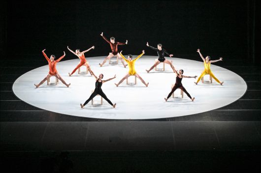 #<캄머발레(Kammerballett)>의 무대는 하얀 원형 공간이다. 노란색, 주황색, 갈색, 검은색의 반짝이는 레오타드를 입은 8명의 무용수가 사각형 스툴과 함께 한 명씩 등장한다. 이들은 서로의 간격을 계산하듯 리듬에 따라 흩어지고 정지하고, 양편으로 스툴을 정렬하고 일사불란한 움직임을 이어간다. 둘에서 셋 다시 쌍으로 변해가는 안무는 피아노 음악과 놀라울 정도로 정교하게 맞물려 매끄럽게 이어진다. 혼자 남았다는 사실을 깨달은 후 맹렬한 몸짓과 함께 사라지는 여성 무용수가 남기는 여운.