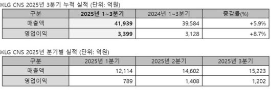 LG CNS는 3분기 연결기준 매출 1조5223억원, 영업이익 1202억원을 기록했다. 전년 동기 대비 매출은 5.8% 늘었지만 영업이익은 15.8% 줄며 수익성이 후퇴했다. 반면 클라우드·AI 부문 매출은 10.6% 늘어 전체 성장을 견인했다. AI 데이터센터 사업 확대와 금융·공공 AI 프로젝트 수요 증가가 유효했다.