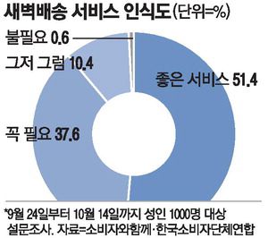 새벽배송이 중단될 경우 불편이 클 것으로 꼽은 항목은 장보기(38.3%)가 가장 많았고, 이어 일상생활(28.0%), 여가생활(14.3%), 육아 및 자녀 학업지원(14.2%), 반려동물 돌봄(5.1%) 순이었다. 반면 "불편하지 않다"는 응답은 9.4%에 그쳤다. 이 조사는 소비자와함께가 지난달 24일부터 이달 14일까지 전국 성인 남녀 1000명을 대상으로 진행했다.
