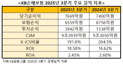 30일 KB금융그룹 2025년 3분기 경영실적 발표에 따르면, KB손해보험은 올해 3분기 누적 기준 7669억원의 당기순이익을 기록했다. 이는 전년 동기 대비 3.6% 증가한 수준이다.