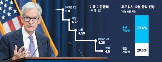 이날 파월 의장의 매파적 발언에 시카고상품거래소(CME) 페드워치에서 12월 금리 동결 가능성이 70.4%까지 급등하고 인상 가능성도 29.6%로 올라갔다. 웰스파고는 "노동시장에 대한 우려가 약화되지 않았다"며 "12월 0.25%포인트 인하 전망을 유지한다"고 밝혔다. 반면 제임스 불러드 전 세인트루이스 연방준비은행 총재는 "주식시장 호황과 전반적인 경제 활동의 성장은 최근 인플레이션 안정을 감안할 때 금리 인하 속도를 늦출 수 있다"고 평가했다.