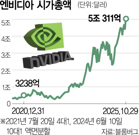 29일(현지 시간) 뉴욕증시에서 엔비디아는 전 거래일보다 2.99% 상승한 207.04달러에 마감했다. 주가가 사상 최고치를 다시 쓴 덕분에 시총도 5조 311억 달러까지 불어났다. 이는 시총 2위인 마이크로소프트(4조 254억 달러)보다도 1조 달러 이상 많다. 전 세계 증시에서 시총 5조 달러를 넘은 기업은 엔비디아가 역사상 처음이다. 엔비디아의 시총은 7월 4조 달러의 벽을 넘어선 지 석 달 만에 1조 달러 이상 늘었으며 2022년 챗GPT가 출시된 후 엔비디아 주가는 12배 넘게 올랐다. 올해 들어서만 주가는 57% 급등했고 스탠더드앤드푸어스(S&P)500지수의 연초 이후 상승률(17.5%) 중 약 20%가 엔비디아의 강세 덕분이라는 분석도 나온다. 특히 엔비디아의 시총은 미국·중국에 이어 경제 규모가 세 번째로 큰 독일을 넘어서게 됐다. 국제통화기금(IMF)은 올해 독일의 명목 GDP가 5조 100억 달러에 이를 것으로 전망했다. 블룸버그통신에 따르면 엔비디아의 기업가치는 네덜란드, 스페인, 아랍에미리트(UAE), 이탈리아, 폴란드 증시 전체 시총을 합친 것보다 더 크다. 하그리브스랜스다운의 맷 브리츠먼 애널리스트는 “엔비디아의 시총 5조 달러 돌파는 기술 산업의 지형을 바꾼 역사적 선언”이라며 “AI 산업의 규모를 시장이 과소평가하고 있다. 이 주식은 여전히 비싸지 않다”고 말했다.
