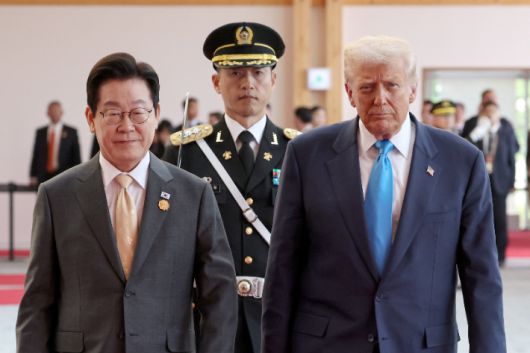 이재명 대통령과 도널드 트럼프 미국 대통령이 지난 29일 경북 경주박물관에서 열린 공식 환영식에서 의장대를 사열하는 모습. 연합뉴스 |