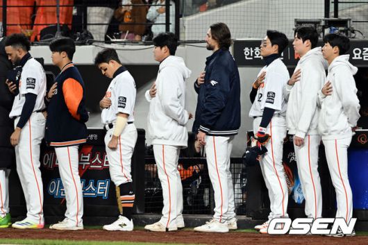 [OSEN=대전, 손용호 기자] 30일 대전 한화생명볼파크에서 2025 신한 SOL Bank KBO리그 포스트시즌 한국시리즈 4차전 한화 이글스와 LG 트윈스의 경기가 열렸다. 이날 경기에 한화는 와이스를, LG는 치리노스를 선발투수로 내세웠다. 선발 와이스가 식전행사에서 국기에 대한 경례를 하고 있다. 2025.10.30/spjj@osen.co.kr