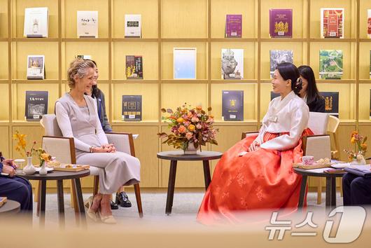 김혜경 여사와 캐나다 총리 부인 다이애나 폭스 카니 여사가 30일 경북 경주박물관 신라천년서고에서 환담하고 있다. (대통령실 제공. 재판매 및 DB 금지) 2025.10.30/뉴스1 ⓒ News1 허경 기자 |