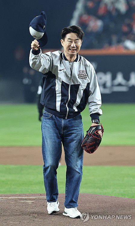 (대전=연합뉴스) 김인철 기자 = 30일 대전한화생명볼파크에서 열린 2025 프로야구 KBO리그 포스트시즌 한국시리즈 4차전 LG 트윈스와 한화 이글스의 경기. 개그맨 남희석이 시구를 하며 관중들에게 인사하고 있다. 2025.10.30