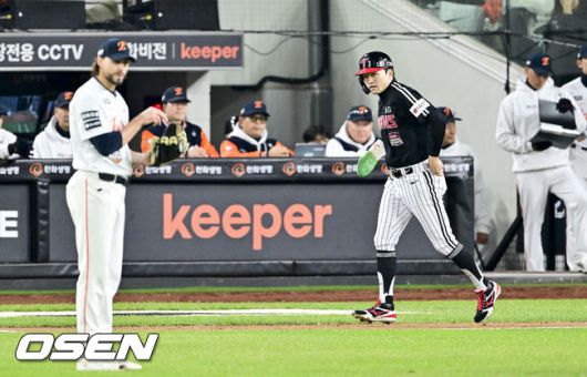 [OSEN=대전, 박준형 기자] 30일 대전 한화생명볼파크에서 2025 신한 SOL Bank KBO리그 포스트시즌 한국시리즈 4차전 한화 이글스와 LG 트윈스의 경기가 열렸다. 이날 경기에 한화는 와이스를, LG는 치리노스를 선발투수로 내세웠다. 3회초 1사 LG 박해민이 볼넷으로 출루하고 있다. 2025.10.30 / soul1014@osen.co.kr