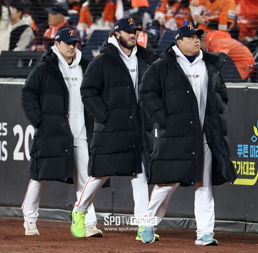 [스포티비뉴스=대전, 곽혜미 기자] 2025 신한 SOL뱅크 KBO 한국시리즈 한화와 LG의 4차전이 30일 오후 대전 한화생명 볼파크에서 열렸다. 한화 문동주, 폰세, 류현진이 더그아웃으로 향하고 있다. <저작권자 ⓒ SPOTV NEWS. 무단전재 및 재배포 금지>