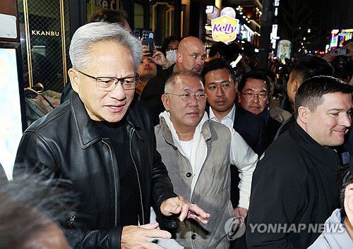 (서울=연합뉴스) 이진욱 기자 = 아시아태평양경제협력체(APEC) 정상회의를 계기로 한국을 찾은 젠슨 황 엔비디아 최고경영자와 정의선 현대차그룹 회장이 30일 서울 삼성동 한 치킨 집으로 들어서고 있다. 2025.10.30 [공동취재]