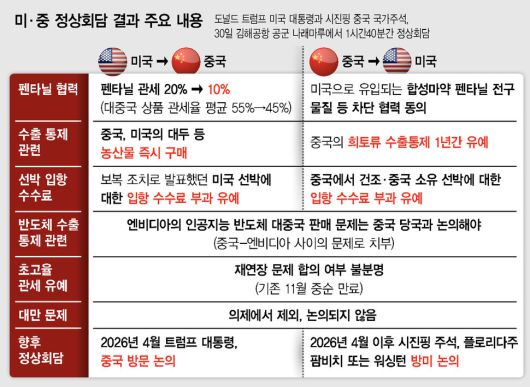 미국과 중국이 30일 정상회담을 통해 첨예한 무역·경제 의제에 대한 합의점을 마련한 뒤, 즉시 이행에 들어갔다. 미국과 중국은 당장 눈에 보이는 ‘성과’에 집중했지만, 무역 구조와 보조금 문제 등 근본적 쟁점은 남아 있어 양국 긴장이 단기간 내 다시 불붙을 가능성도 제기된다.