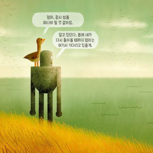 아기 기러기는 하루가 다르게 무럭무럭 자랐다. “엄마, 저 걷는 거 어때요?” “엄마, 저 수영하는 것 좀 보세요!” “엄마, 제가 날고 있어요.” 그러던 브라이트빌이 로즈의 어깨에 앉아서 말한다. “엄마 잠시 섬을 떠나야 할 거 같아요.” 겨울이 오기 전에 남쪽으로 날아가야 한다고 ‘본능’이 속삭인 것이다. 하얀 겨울을 그리움으로 보낸 로즈에게 꽃분홍 봄이 찾아왔다. 엄마와 아들은 그렇게 다시 함께가 됐다.