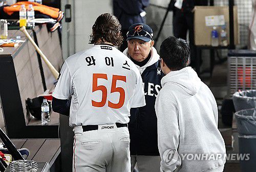(대전=연합뉴스) 김인철 기자 = 30일 대전한화생명볼파크에서 열린 2025 프로야구 KBO리그 포스트시즌 한국시리즈 4차전 LG 트윈스와 한화 이글스의 경기. 8회초 교체된 한화 선발 투수 와이스가 더그아웃에서 김경문 감독으로부터 격려를 받고 있다. 2025.10.30