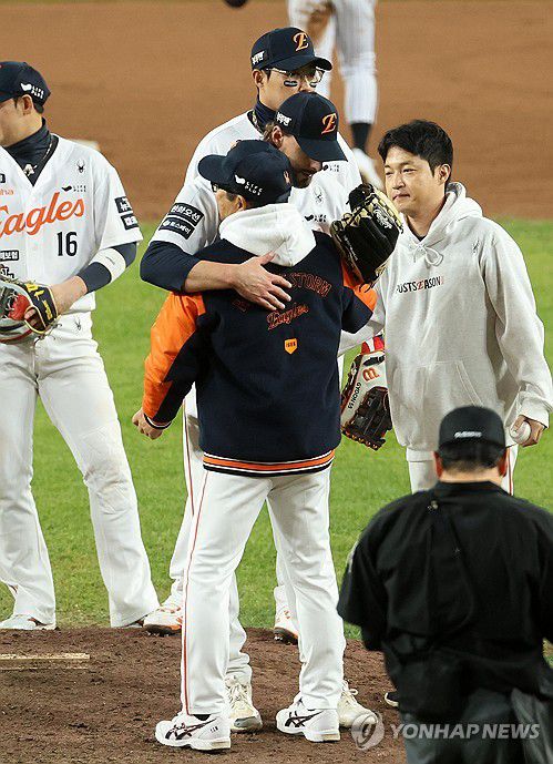 (대전=연합뉴스) 김준범 기자 = 30일 대전한화생명볼파크에서 열린 2025 프로야구 KBO리그 포스트시즌 한국시리즈 4차전 LG 트윈스와 한화 이글스의 경기. 8회초 2사 2루 때 한화 와이스가 마운드에서 내려가며 양상문 코치와 포옹하고 있다. 2025.10.30