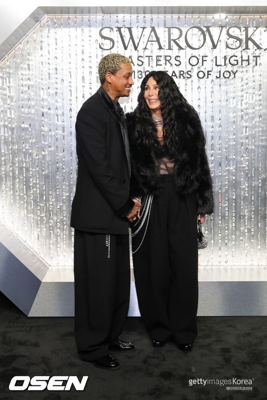 이날 셰어는 블랙 시스루 보디슈트 위에 퍼 크롭 재킷을 걸치고, 측면에 체인 장식이 달린 와이드 팬츠를 매치해 독보적인 카리스마를 뽐냈다. 특유의 흑발 웨이브 헤어와 글래머러스한 주얼리로 ‘불변의 디바’다운 존재감을 드러냈다.