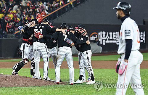 (대전=연합뉴스) 김인철 기자 = 30일 대전한화생명볼파크에서 열린 2025 프로야구 KBO리그 포스트시즌 한국시리즈 4차전 LG 트윈스와 한화 이글스의 경기. 7-4로 역전 승리한 LG 선수들이 승리를 자축하고 있다. 2025.10.30