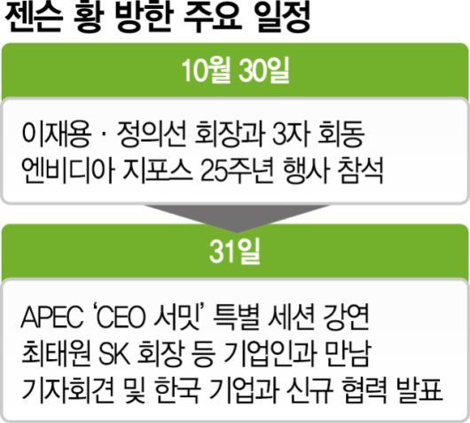 황 CEO는 31일 아시아태평양경제협력체(APEC) 행사 참석을 위해 경주로 이동한 뒤 ‘APEC CEO 서밋’에 참가해 주요 기업인과 만난다. 최태원 SK 회장, 이해진 네이버 이사회 의장과의 만남도 예정돼 있다.