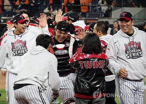 (대전=연합뉴스) 김준범 기자 = 30일 대전한화생명볼파크에서 열린 2025 프로야구 KBO리그 포스트시즌 한국시리즈 4차전 LG 트윈스와 한화 이글스의 경기에서 승리한 LG 선수들이 기쁨을 나누고 있다. 2025.10.30