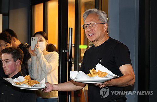 (서울=연합뉴스) 이진욱 기자 = 젠슨 황 엔비디아 최고경영자가 30일 서울 삼성동 한 치킨집에서 진행된 이재용 삼성전자 회장, 정의선 현대차그룹 회장과 치맥 회동 중 시민에게 치킨과 감자튀김을 나눠주고 있다. 2025.10.30 [공동취재]