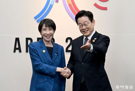 이재명 대통령이 30일 경북 경주 APEC 정상회의장에서 다카이치 사나에 일본 총리와 한-일본 양자회담에 앞서 기념사진을 찍고 있다. 경주=송은석 기자 silverstone@donga.com |