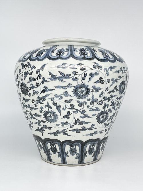 현존하는 조선 전기 청화백자는 매우 드물다. 청화백자를 제작하기 위해서는 값비싼 외국산 청화 안료가 필요했고, 원칙적으로 왕실에서만 청화백자를 사용할 수 있어 제작된 수량 자체가 많지 않다. 항아리 몸 전체에 청화 안료를 사용해 보상화 무늬를 섬세하게 장식했고, 상단과 하단에는 연화문 띠를 둘렀다.