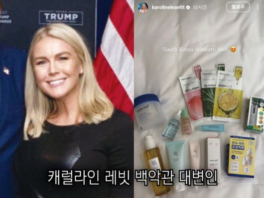 도널드 트럼프 미국 대통령의 국빈 방한에 동행한 캐럴라인 레빗(28) 백악관 대변인도 경주의 올리브영을 찾았다. 다양한 브랜드의 아이크림, 세럼, 모공패드 등 13개 제품 사진을 ‘한국 스킨케어 추천템’이란 문구와 함께 소셜미디어에 올렸다. 미국 역사상 최연소 백악관 대변인인 그의 인스타그램 팔로어 수는 258만명이다.