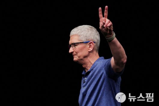 지난 10일(현지시간) 미국 캘리포니아주 쿠퍼티노에서 열린 세계개발자회의(WWDC)에서 팀 쿡 애플 최고경영자(CEO)가 손가락으로 브이(V)자를 그리고 있다.[사진=로이터 뉴스핌] |