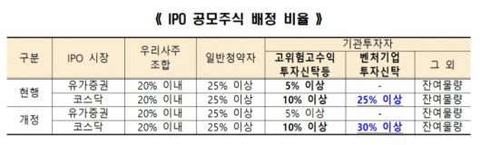 우리사주 조합은 20% 이내, 일반청약자는 25% 이상 배정된다. '고위험고수익투자신탁'은 국내 비우량 회사채(BBB 이하)를 상당 부분 소화하며 주요 수요기반 역할을 하고 있어 현행(10% 이상)을 유지한다.