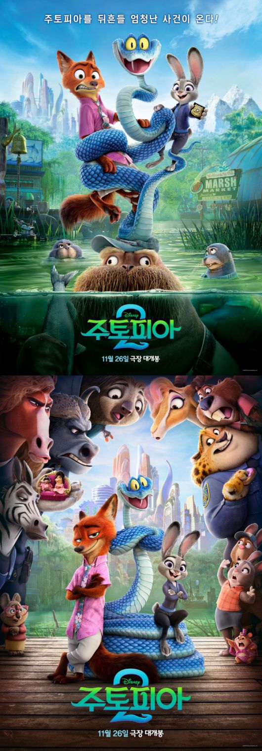 공개된 포스터에는 전편의 흥행을 이끈 반가운 오리지널 캐릭터들은 물론 한층 다양해진 동물들과 새롭게 등장하는 구역인 '마시 마켓'까지 담겨있어 관객들의 상상력을 자극한다. 1편에서 큰 사랑을 받았던 나무늘보 플래시, 경찰서를 지키는 치타 클로하우저, 주토피아 시티 최고의 팝스타인 가젤 등 반가운 얼굴들에 이어 이번 작품의 핵심 캐릭터로 등장하는 미스터리한 푸른 뱀 '게리', 그리고 귀여운 비주얼의 쿼카, 비버 등 새로운 캐릭터들이 합류했다.