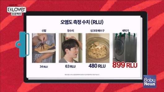 1화 '더LOVE게 심각한 나의 세탁기’ 편에 출연한 6인 가족은 하루 사용 수건만 20장이 넘는 등 잦은 빨래로 인해 빨래 후에도 세탁물에서 쉰내가 난다는 고민으로 방문 케어를 신청했다. 3년 간 사용한 이 가족의 세탁기 내부 오염도는 899RLU로 측정됐다(실시간 세균오염도 측정기 '클린큐’ 사용). 비교군으로 현장에서 함께 측정한 김원훈 대리의 정수리 오염도는 63RLU, 촬영감독의 신발 오염도는 34RLU, 음식물이 꽉 찬 싱크대 배수구 오염도는 480RLU였다.
