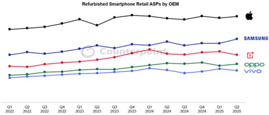 카운터포인트에 따르면 2025년 상반기 리퍼폰 시장은 가격 변동성이 컸으나 ASP는 전반적으로 안정적이었다. 브랜드별로 애플이 가장 높은 중고폰 시세를 유지했고, 삼성 프리미엄 갤럭시 S시리즈와 구글 픽셀이 그 뒤를 이었다. 프리미엄 모델의 보상판매가격은 꾸준히 오르는 추세다.