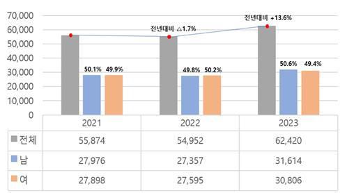 질병관리청은 31일 이런 내용의 ‘2023년 희귀질환자 통계 연보’를 발표했다. 2023년 신규 희귀질환 진단은 총 6만2420명으로 전년 대비 13.6% 늘었다. 이는 ‘다낭성 신장, 보통염색체 우성’(4830명), ‘특발성 비특이성 간질성 폐렴’(313명) 등 42개 질환이 2023년 국가관리 대상 희귀질환으로 새로 지정된 영향이라는 게 질병청의 설명이다.