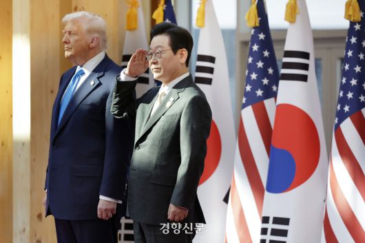 이재명 대통령이 지난 29일 경북 경주박물관에서 열린 도널드 트럼프 미국 대통령 공식 환영식에서 거수경례를 하고 있다. 김창길 기자 |
